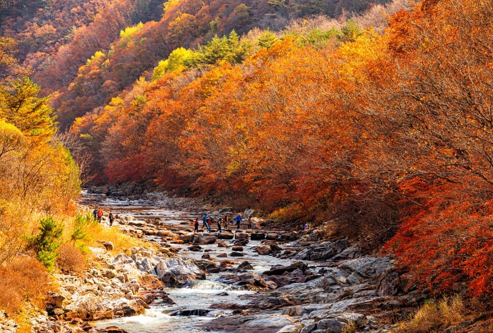 소금강산에서 발원한 수입천의 맑은 물에 손을 담그고, 두타연 징검다리를 건너며 자연의 고요함을 느껴보세요.